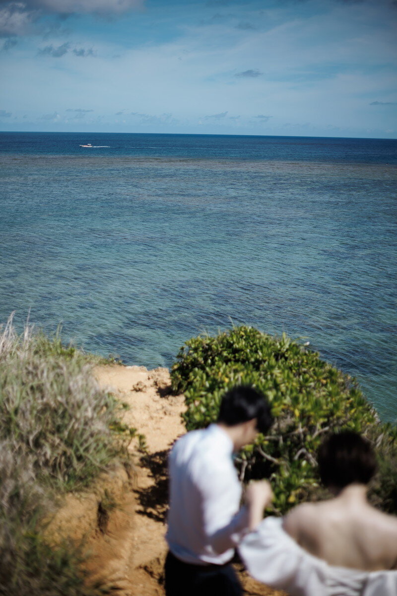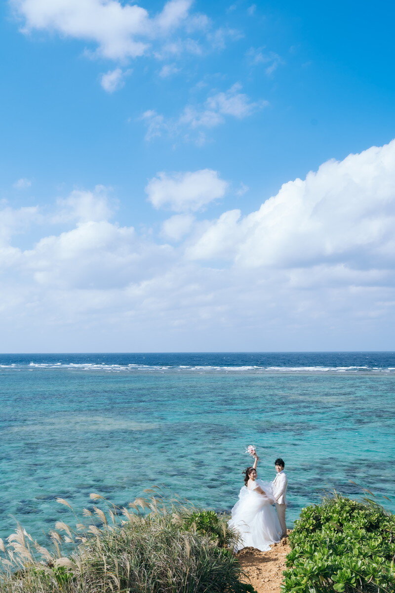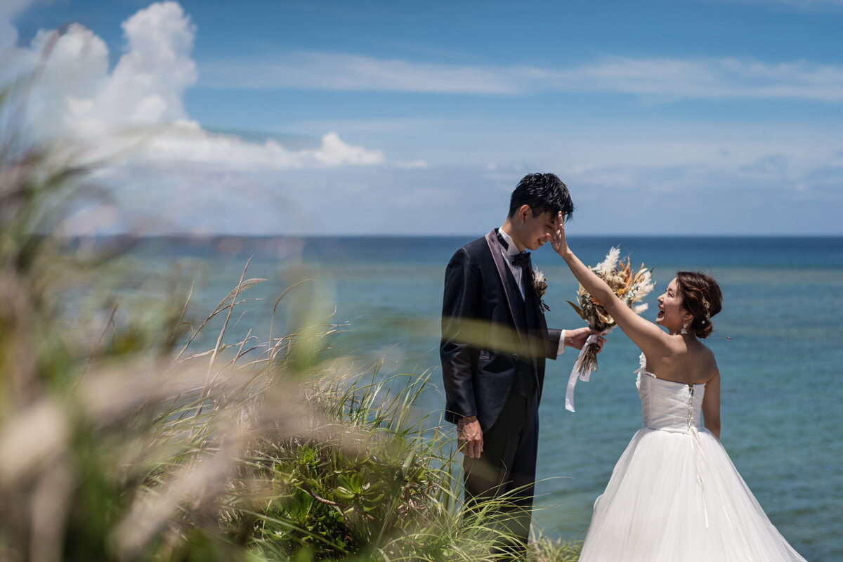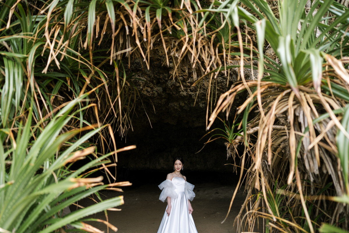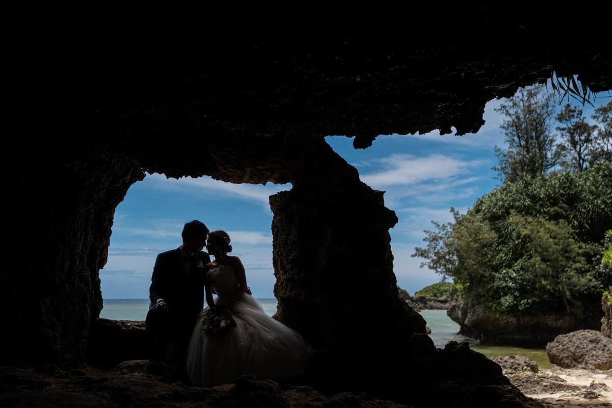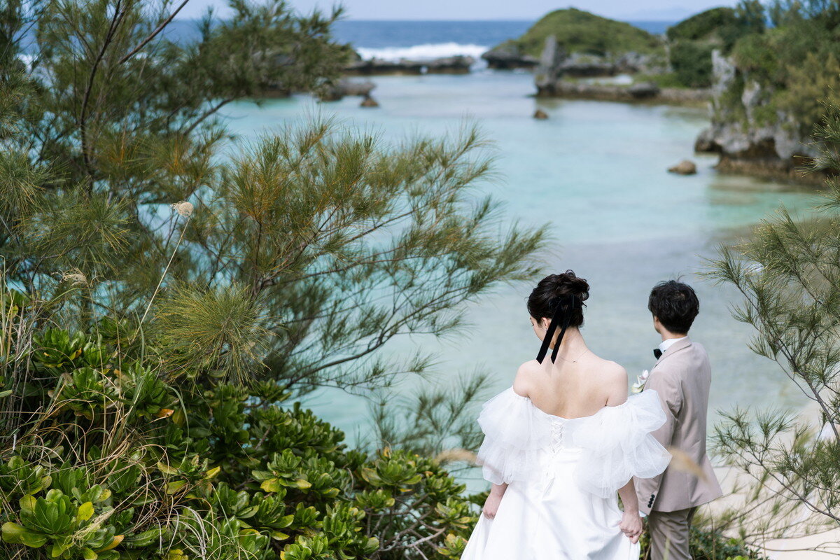 沖縄本島でも数少ない、手つかずの自然が美しく残る ザネー浜。優しい波音だけが響く静かな浜辺は、まるで時がゆっくりと流れるような場所。透明感のある海とダイナミックな岩壁、素朴で力強い自然が、ふたりの瞬間をより深く印象的に映し出します。