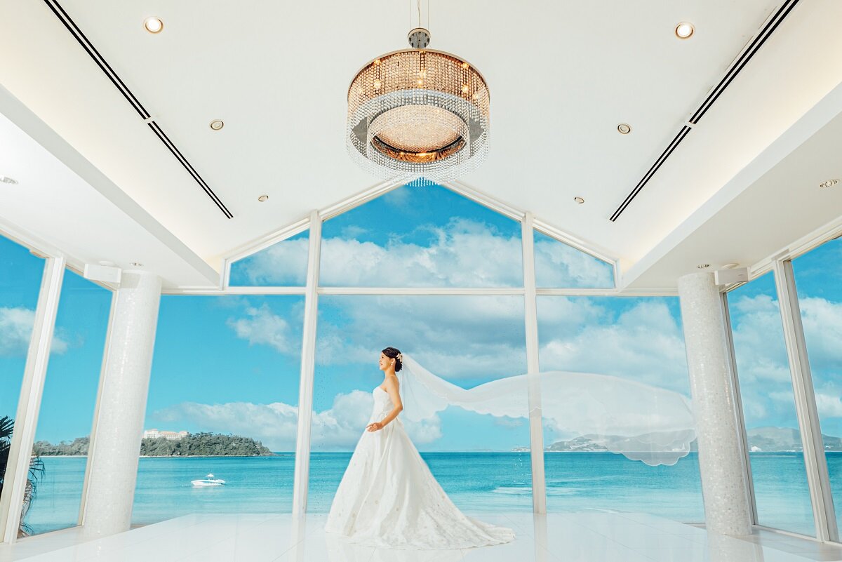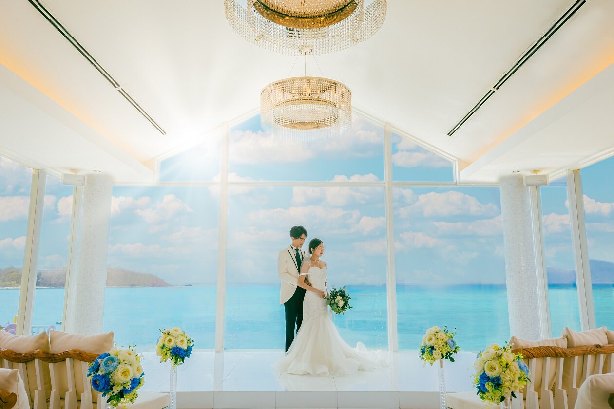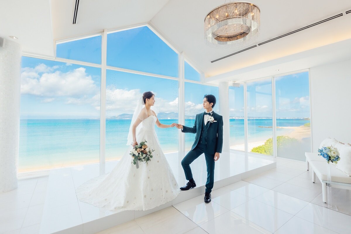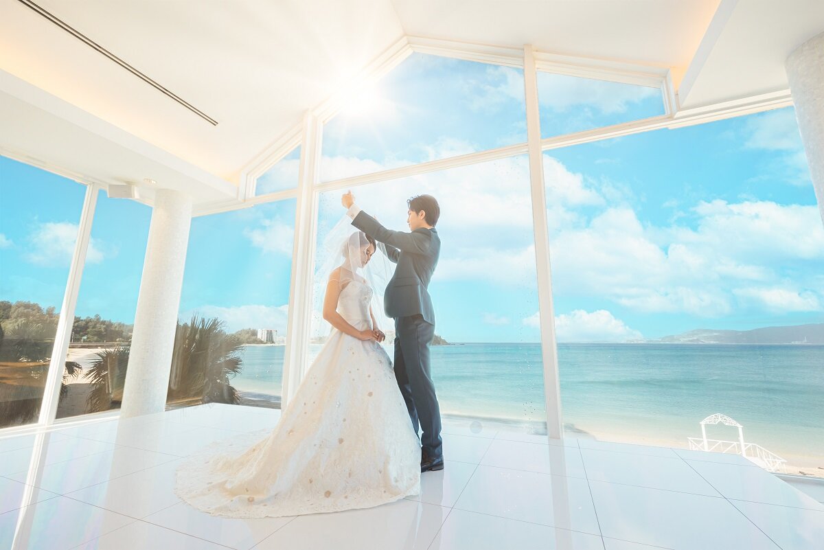 ”海の宝石”という名の通り祭壇からはオーシャンフロントの絶景が広がり、シャンデリアの輝きがまるで宝石のような輝きを放つチャペルでのフォーマル撮影と県内でも美しさで有名な喜瀬ビーチでの撮影が叶うプランです。思わず笑みがこぼれるようなロケーションで、幸せの笑顔に満ちた写真をたくさん残したいおふたりにおすすめです。