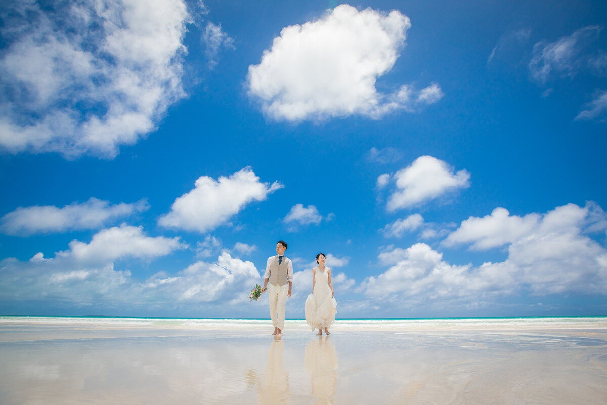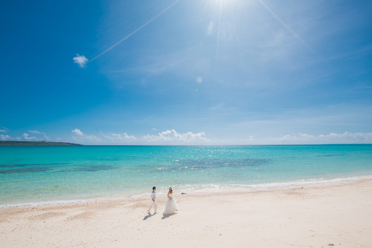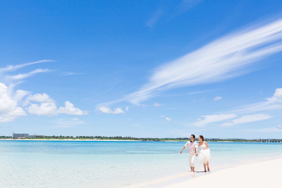東洋1ともいわれる美しさを誇る宮古島のビーチは、青く澄んだ海と真っ白な砂浜のコントラストが最大の魅力です。長く伸びた砂浜は開放的で、瞬く間におふたりを日常から非日常へと導きます。アクティブに撮影も楽しみたいおふたりも、ゆっくりと海を眺めながらのんびり撮影を楽しみたい方にもおすすめの宮古島ビーチで贅沢なフォトウェディングが叶います。