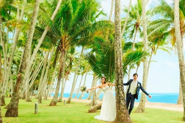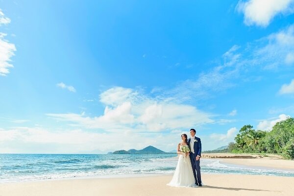世界遺産グレートバリアリーフを望む、パームツリーに囲まれたガラス張りのアラマンダチャペル。チャペルからは180度広がる紺碧の海が一望でき、緑豊かなパームツリーと青い海が織りなす美しいコントラストの中で撮影が叶います。ビーチでは、白い砂浜と青い海を背景にロマンティックなシーンをお楽しみいただけます。