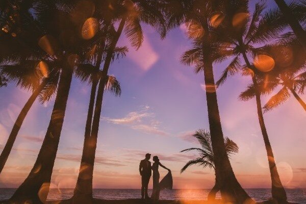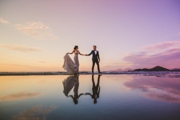 ケアンズ近郊のビーチで行う、サンセットタイムのロマンティック撮影。撮影用の手持ち花火やスパークリングワインを使って、おふたりらしい世界観を表現できます。幻想的な夕景とともに、特別な瞬間をカタチに残せます。