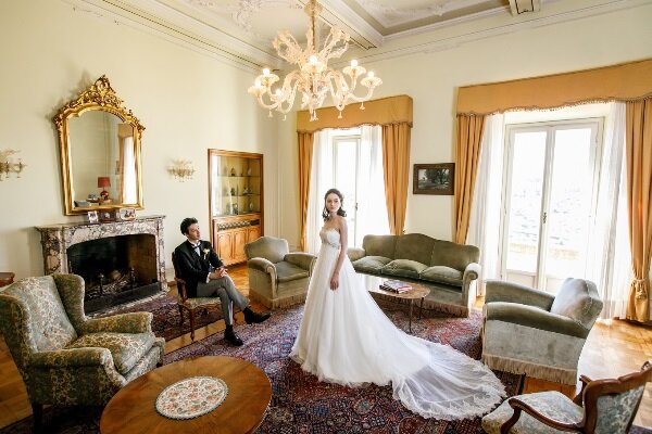 小高い丘の上に静かに佇む緑豊かなエミリア・チャペル。ここでしか撮ることができない特別な景色があります。衣裳も現地にあるデザインからお好みの1着を選べるので安心してご出発いただけます。邸宅内ではアンティーク調の家具が並ぶ落ち着いた空間での撮影、庭園ではフィレンツェの街を一望しながらも自然を感じられる癒しの撮影が叶います。