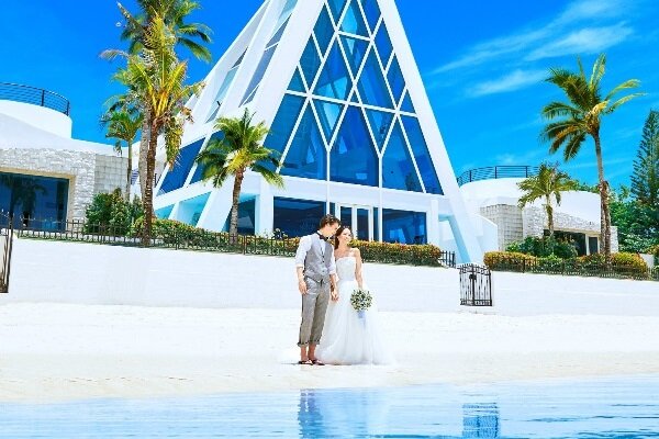 全方向ガラス張りのブルーアステールチャペル。訪れる人すべてを虜にするほどのロマンチックなチャペルは青い海と青い空が溶け合う空間に純白の大理石のバージンロードが輝きます。美しいチャペルでのフォーマル撮影とリゾートならではのビーチ撮影がおふたりの大切な一日をかけがえのない時間へと導きます