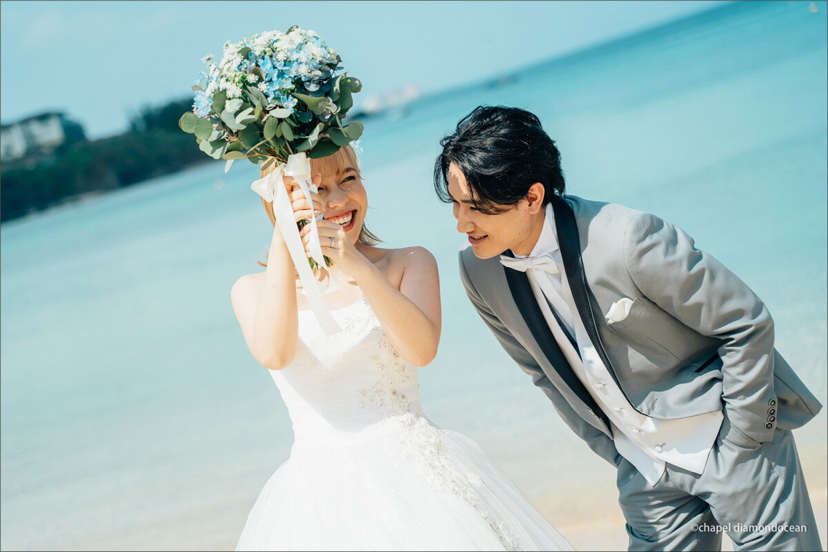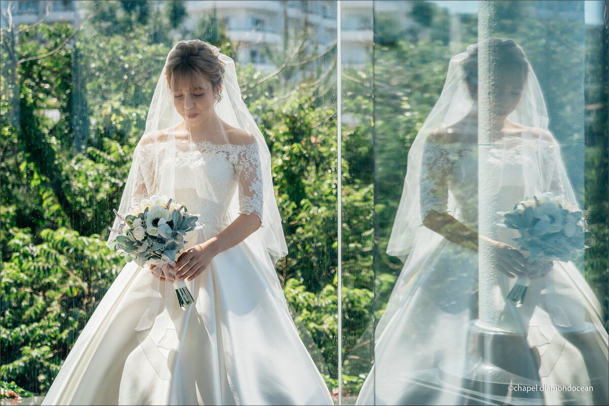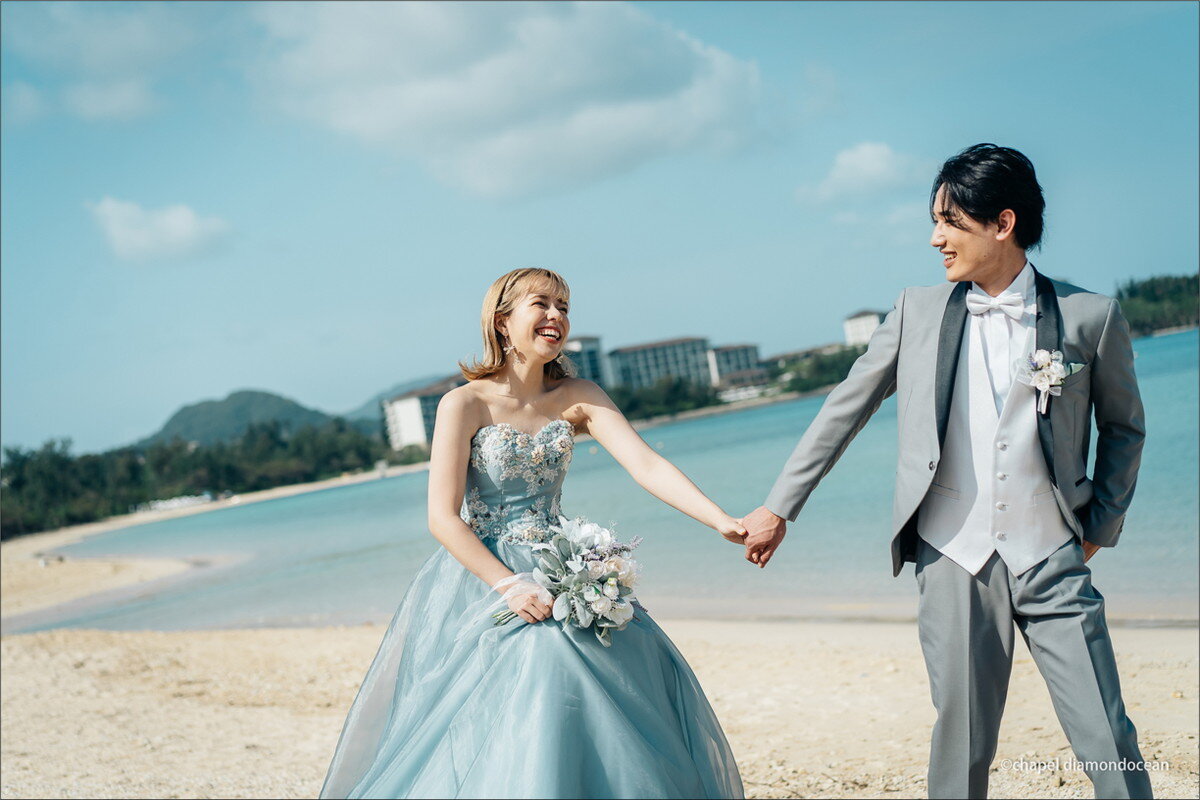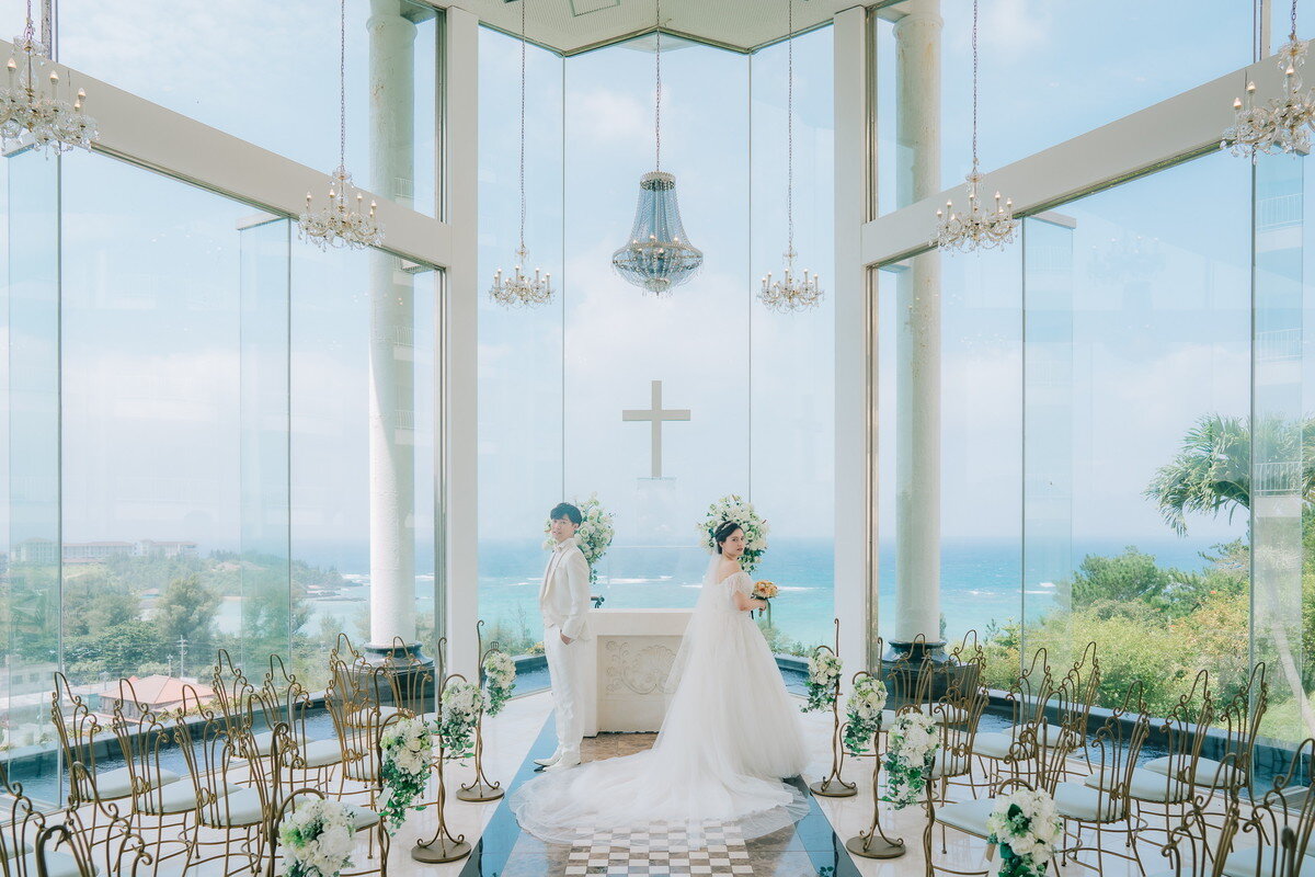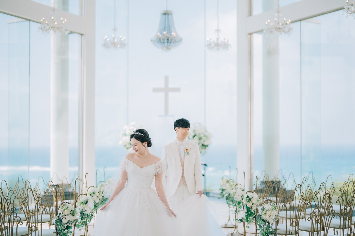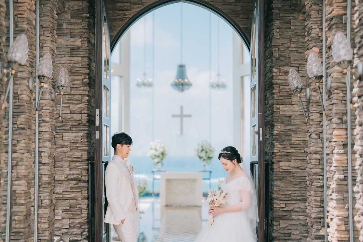 全面ガラス張りのチャペルでは、海と空に囲まれたような幻想的な写真を。続くビーチ撮影では、自然な笑顔と開放感あふれる一枚を残せます。異なるロケーションで撮影できる、満足度の高いフォトウェディングプランです。