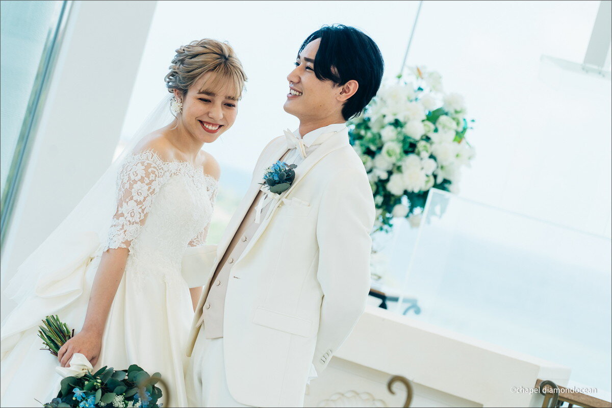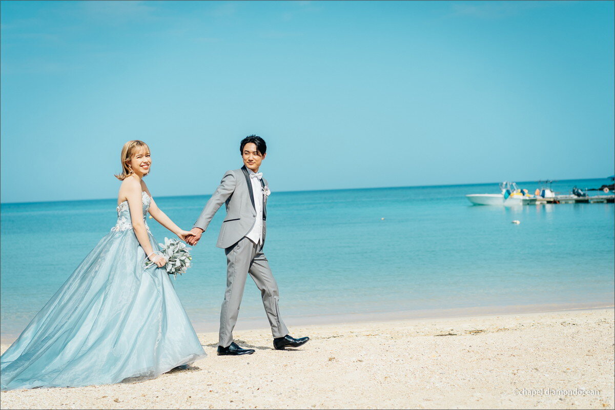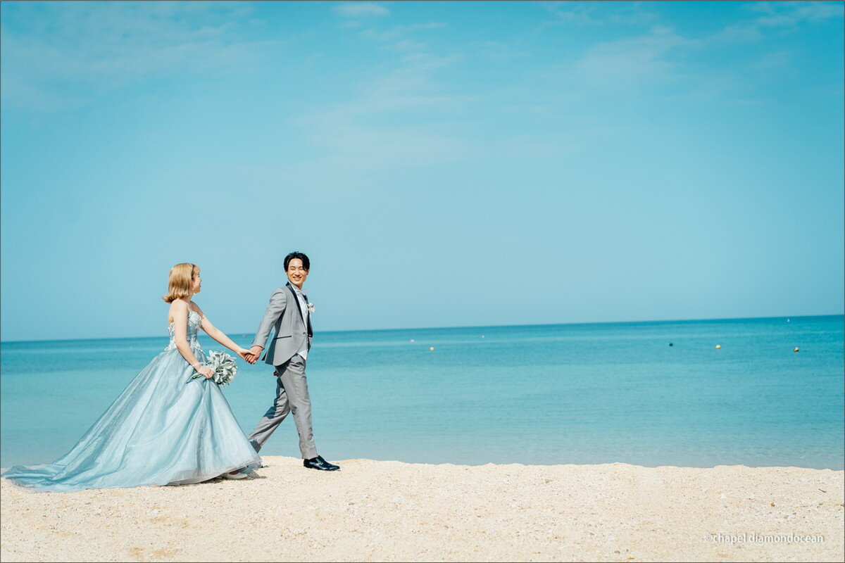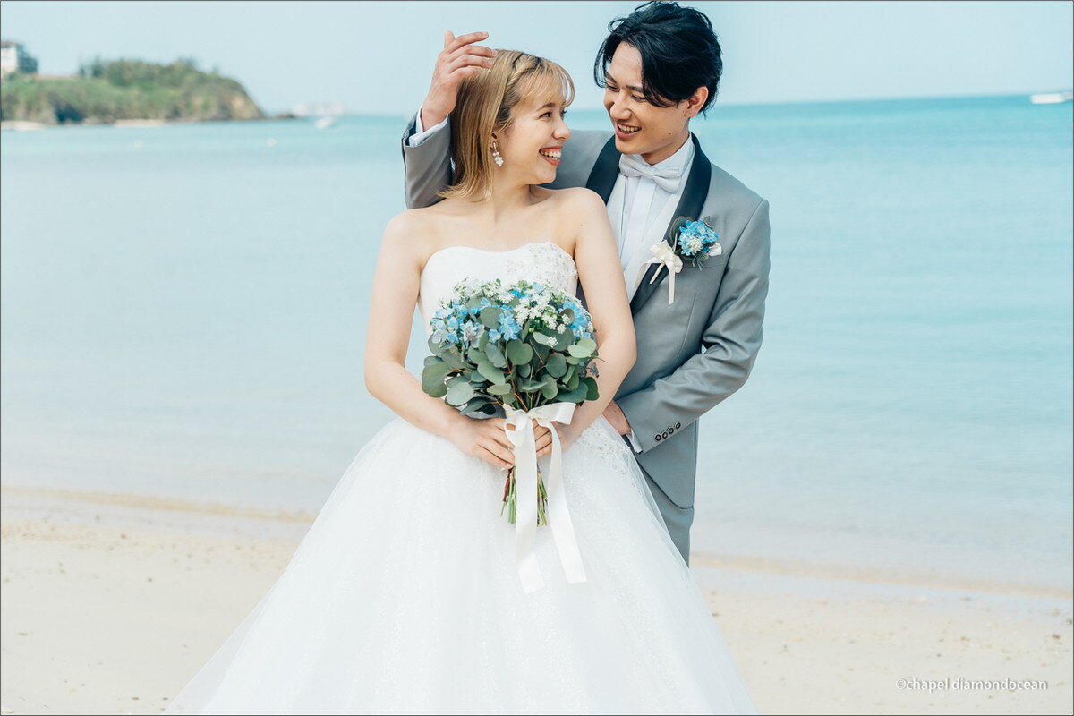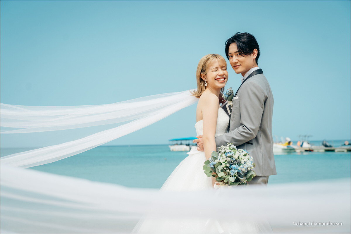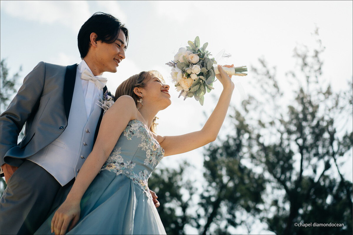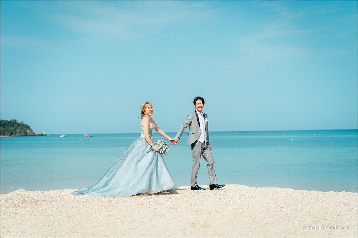 全面ガラス張りのチャペルでは、海と空に囲まれたような幻想的な写真を。続くビーチ撮影では、自然な笑顔と開放感あふれる一枚を残せます。異なるロケーションで撮影できる、満足度の高いフォトウェディングプランです。