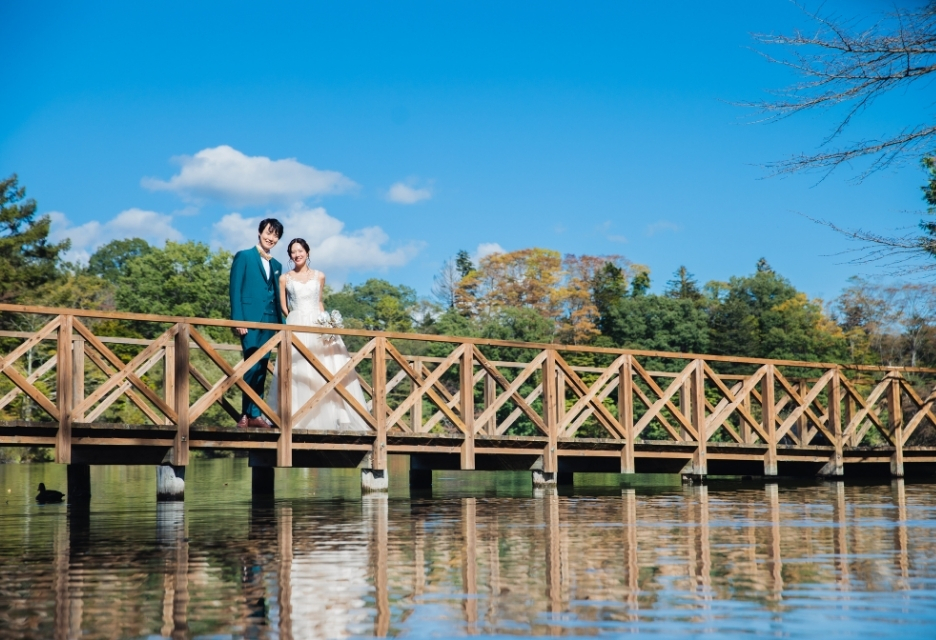 ロケーションフォトでは開放感溢れる自然の中で、おふたりらしい笑顔を引き出します。写真として残すだけでなく、想い出そのものをかたちにできます。