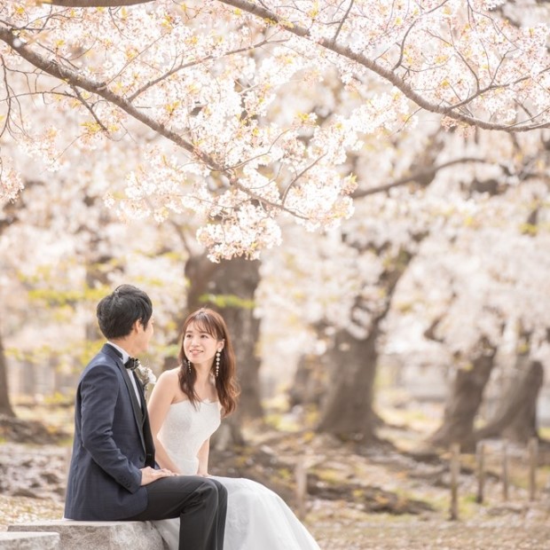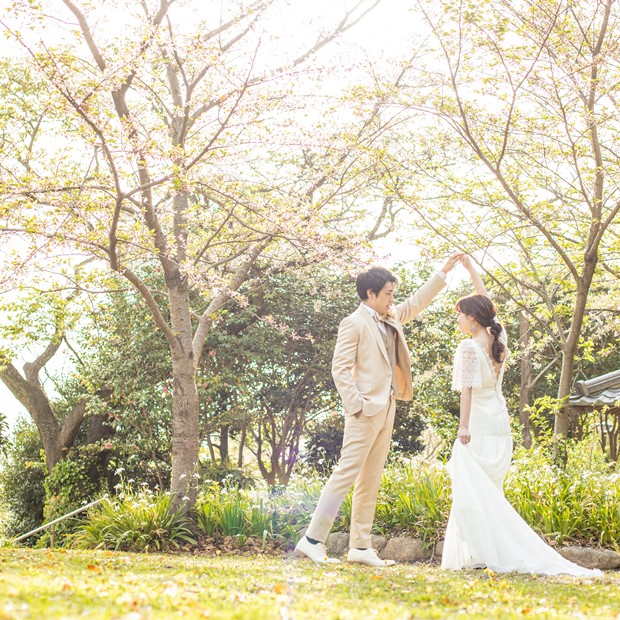 カラフルな花を背景に、木漏れ日や逆光などをいかした、明るく色鮮やかな雰囲気の写真が残せます。自然の中で、いつもの二人らしいナチュラルな写真を残したいという方にぴったりな撮影場所です。