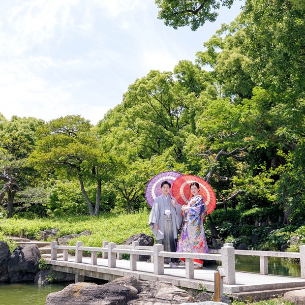 都内の庭園では数少ない「水面を自然に写しこめる広い池」が魅力で、東京の和装ロケでも人と違った写真を残したい方におすすめです。