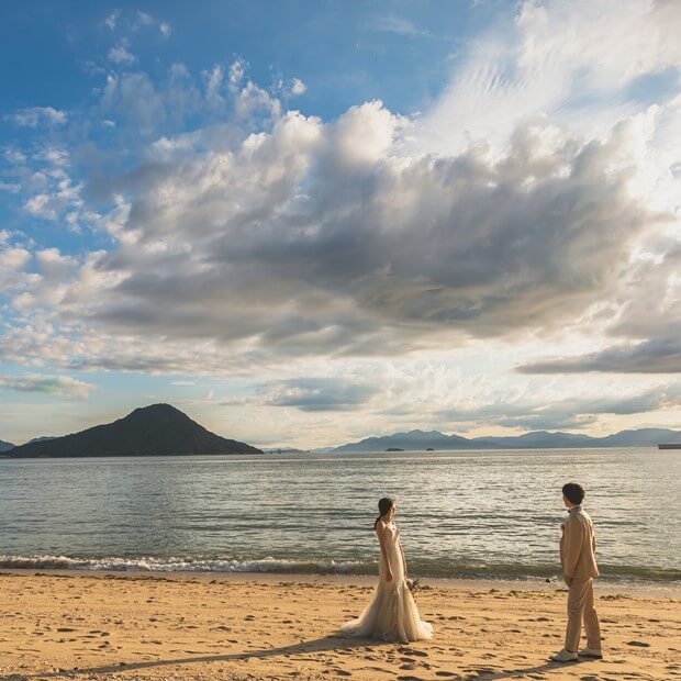 海辺では砂浜を歩いたり、貝殻を探したりするシーンを撮影すると印象深い素敵な一枚が残せます。特徴的な崖を背景にすると、お二人の遊び心を引き立てた写真が撮れます。どのシーンも自然の美しさと共に、二人の愛を表現できる写真になるはずです。