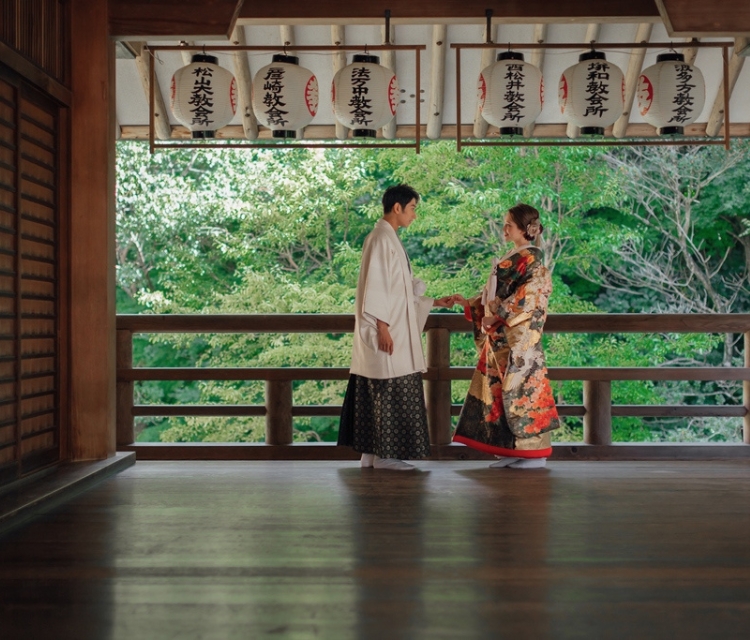 豊かな緑の中での撮影やスケールの大きな神殿での撮影が可能です。また、洋装や和装の両方のスタイルでの撮影もできます。まだあまり知られていない穴場スポットであり、新郎様にも人気があります。さらに、桜の撮影も楽しめますし、秋の紅葉シーズンもおすすめです。