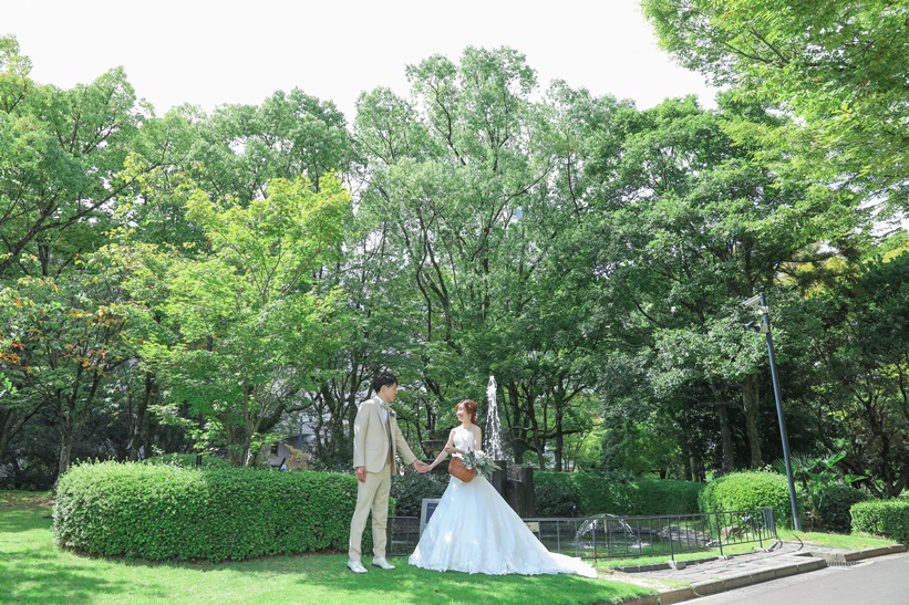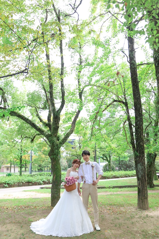 ナチュラルな雰囲気のお衣裳、緑豊かな公園での撮影にぴったりですね。随時、お衣裳試着付き相談会も実施しておりますので、撮影プランを衣裳軸で決めたいという方にも安心してご相談にお越しいただけます。 お気軽にご相談くださいませ。