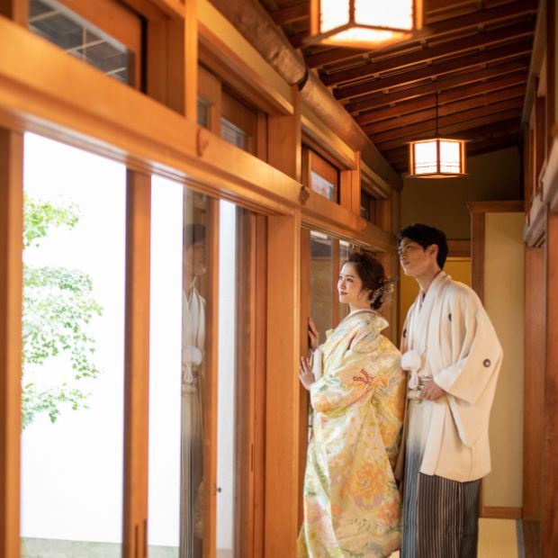 重要文化財に指定されている客殿(きゃくでん)で撮影ができ、貴重な体験として人気があるプランです。挙式も執り行われる神社で本格的な和装ウェディングフォトが残せます。