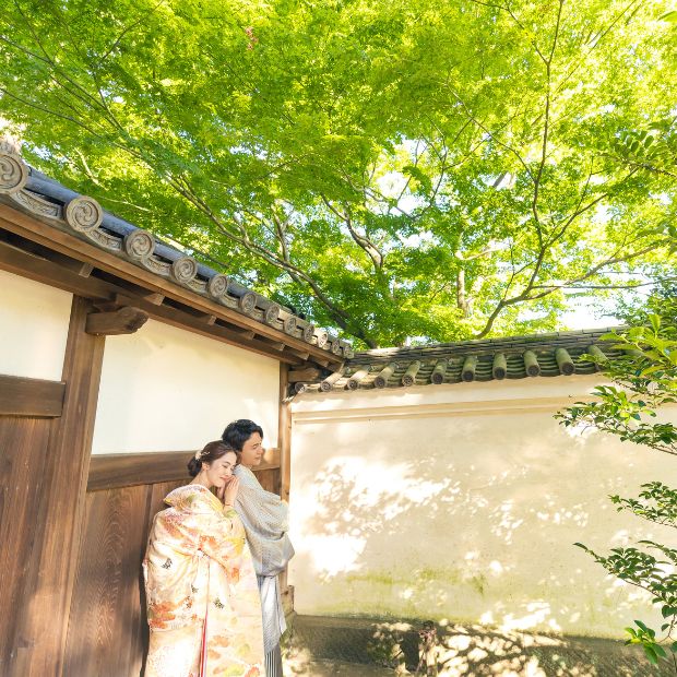 春には桜、夏には紫陽花や新緑、秋にはイチョウ、冬には紅葉や梅、その他様々な植物が咲いていて、いつでも季節を感じる写真が残せます。広々とした庭園を散策しながらおふたりの自然な雰囲気を撮影します。