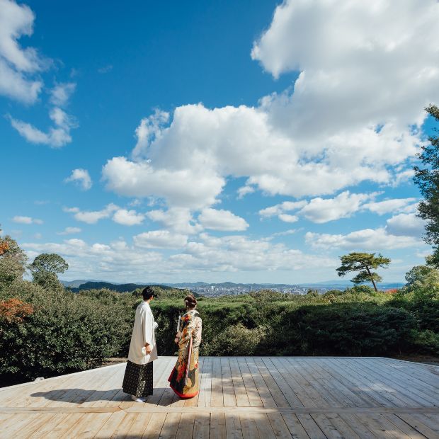 岡山の中心部に近い自然豊かな「神道山」で撮影できるプランです。神社の神殿内での撮影も可能で、頂上にある日拝場所では、広い空と豊かな緑を背景にした壮大で厳かな雰囲気の写真を撮ることができます。