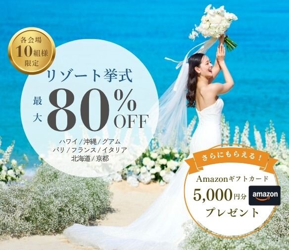 挙式プランが最大80%OFF!更にAmazonギフトカード5,000円分プレゼント!