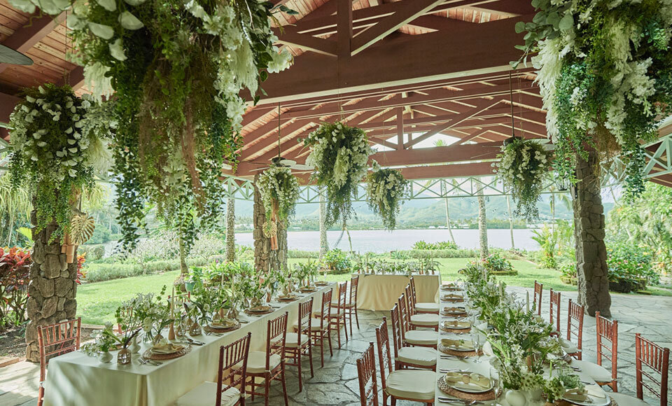 挙式後は、敷地内にある湖を望むガーデンダイニングで、美しい眺望と心地よい海風を感じながらハワイらしいパーティを。