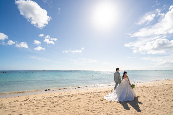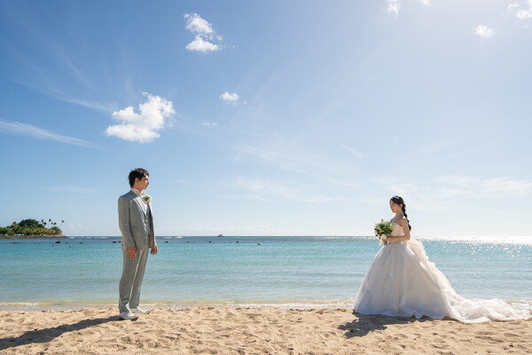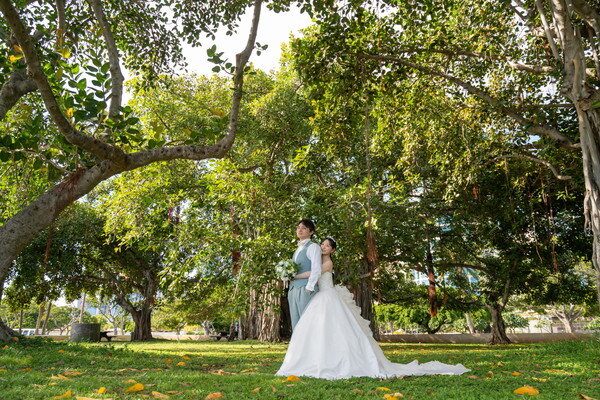 青い空と海に包まれるアラモアナビーチ&パークにて、フォトウェディングを行いました。開放的なビーチに加え、存在感のあるバニアンツリーの下でも撮影を楽しみ、ハワイらしい多彩なロケーションで思い出を残します。