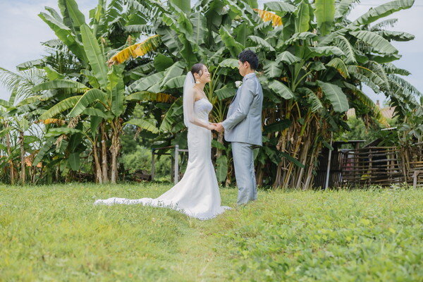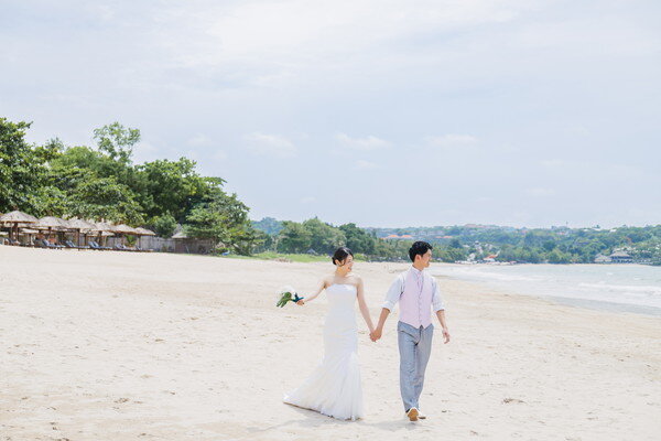 深い緑に包まれたバリニーズビレッジと、美しいビーチを巡るフォトウェディングを行いました。遺跡が点在する空間でバリの文化や自然を感じながら、ゆったりとした時間の中で撮影が進みます。