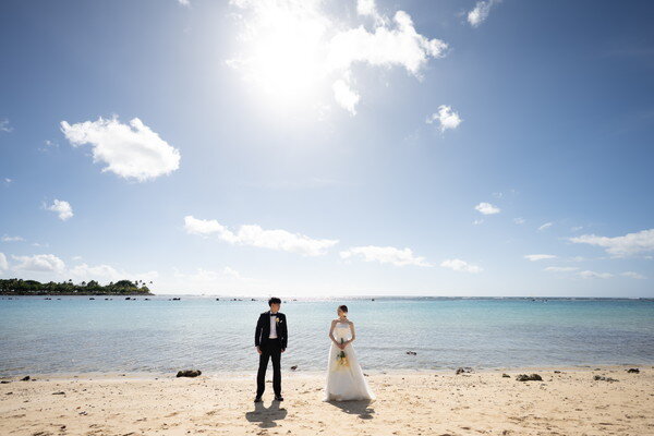 さらに白い砂浜と青い海が広がるビーチでは、リゾートらしい開放感の中で撮影が進みます。異なる魅力のロケーションを背景に、おふたりらしい表情や瞬間を残す特別なひとときとなりました。
