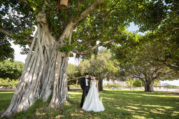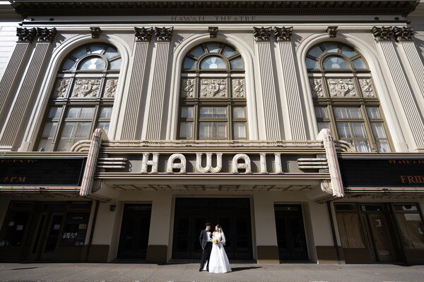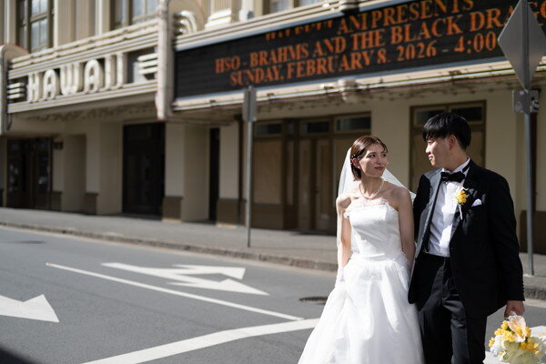 ハワイのビーチとダウンタウンを巡るフォトウェディングを行いました。レトロな街並みとトレンドが融合したダウンタウンでは、映画のワンシーンのような雰囲気ある撮影を楽しめます。