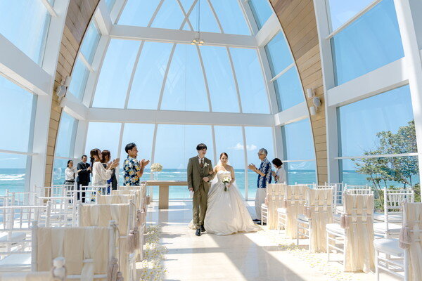 ザ・リッツ・カールトン内のマジェスティックチャペルにて、晴天のもとセレモニーが行われました。ファーストミートではお互いの姿を褒め合う微笑ましいひとときに。挙式後は青い海と白砂のビーチを背景に、フラワーシャワーや撮影を楽しみながら、リラックスした時間が流れました。