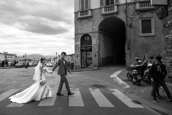 撮影ではご家族とのお写真を中心に、ステンドグラスを背景にしたカットやロングベールを活かしたバックショットなど、教会ならではの印象的なシーンを多数撮影。街並みでの撮影も「どこで撮っても絵になる」とお喜びいただき、笑顔あふれるひとときとなりました。