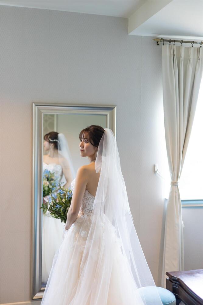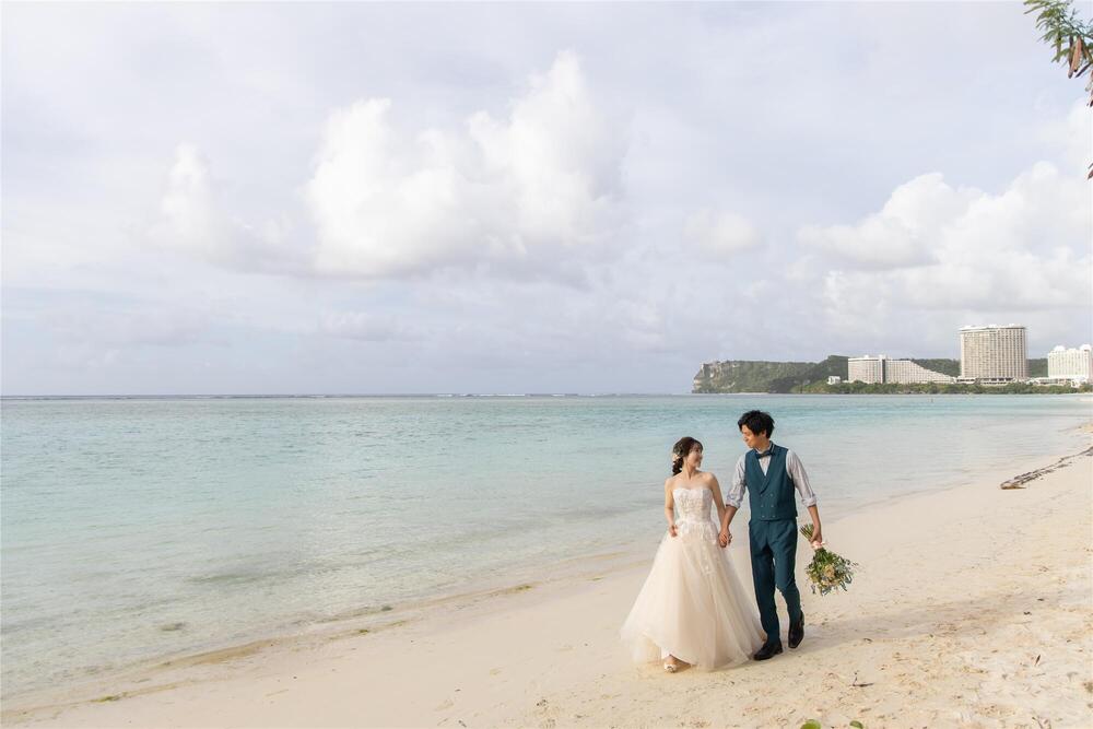 グアムの中心地・タモンにありながら、周囲の喧騒から少し離れた立地。鮮やかなブルーが目を引く全方向ガラス張りのチャペルで、ご家族やご親族と挙式をされました。タモン湾を見渡すチャペルは天井からもたくさんの自然光が差し込み、ウェディングドレス姿をより一層美しく魅せます。