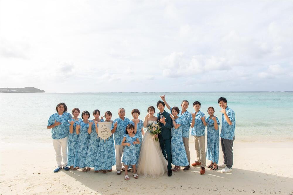 感動に包まれたアットホームな挙式の後は、目の前に広がるビーチで全員集合写真。おふたりでのビーチ撮影もゆっくりと楽しまれました。