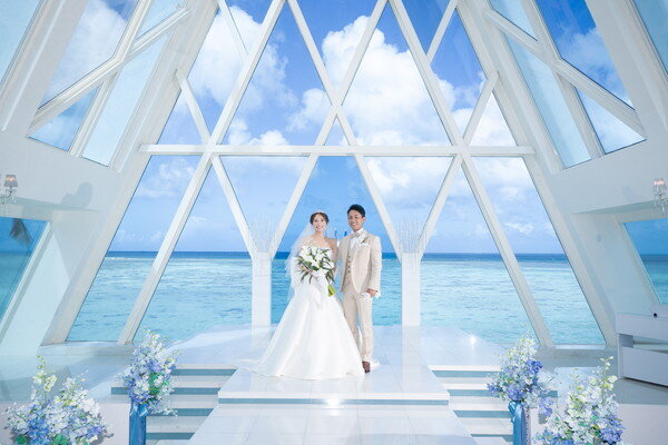 オーシャンフロントに佇むブルーアステールチャペルにて、晴天のもとセレモニーが行われました。ガラス張りの空間から広がる海と空に包まれ、開放感あふれる中で特別な時間がスタート。