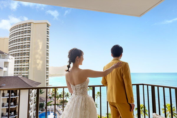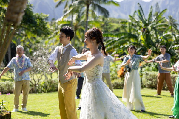 人気会場「ザ・プライベート・ガーデン アロハ・ケ・アクア」にてご挙式を行いました。晴天に恵まれた当日は、リムジンとともに撮影をスタートし、リゾートらしい開放感あふれる一日の始まりでした。挙式後はガーデンにてご両親様へレイの贈呈を行い、ご家族の絆を感じる温かなセレモニーに。