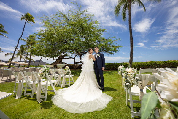 世界中のセレブリティに愛されるハレクラニにて、晴天のもとセレモニーが行われました。歴史あるキアヴェの木に見守られながら、海とガーデンが広がる特別なロケーションで、穏やかな時間が流れる挙式。