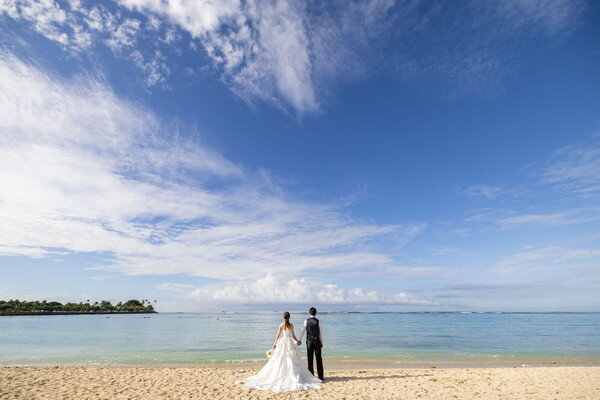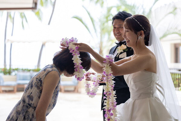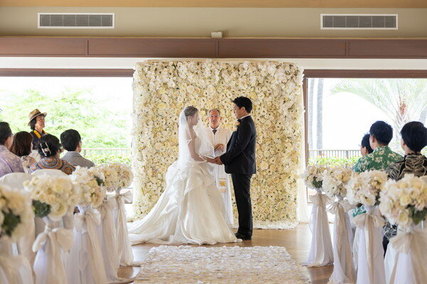 歴史あるハレクラニにて、フラワーウォールを背景にした優雅なセレモニーが行われました。晴れ間と雨が交差する一日となりましたが、その瞬間ごとの景色を楽しみながら、おふたりらしい時間が穏やかに流れていきました。フラワーシャワーやレイセレモニーも心に残るシーンに。