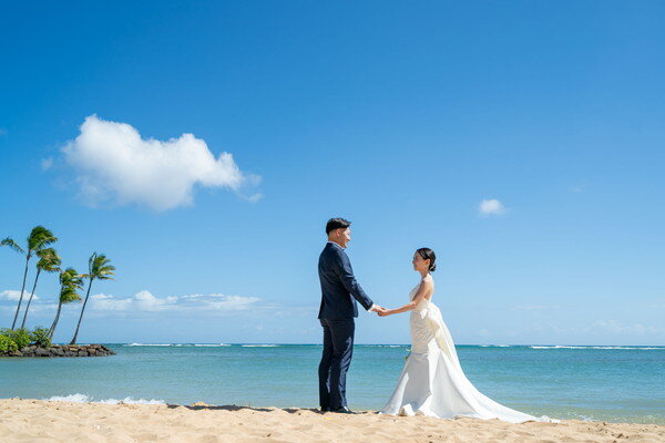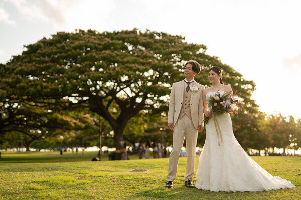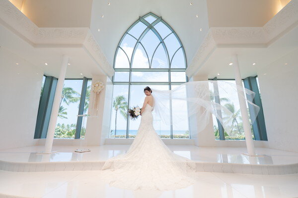 ハワイ・コオリナの美しいラグーンを望む「コオリナ・チャペル・プレイス・オブ・ジョイ」にて、晴天に恵まれたセレモニーが行われました。大きな窓の向こうに広がる海とヤシの木に囲まれ、ゲストの拍手に迎えられてのご入場は、自然と笑顔があふれる印象的なシーンに。