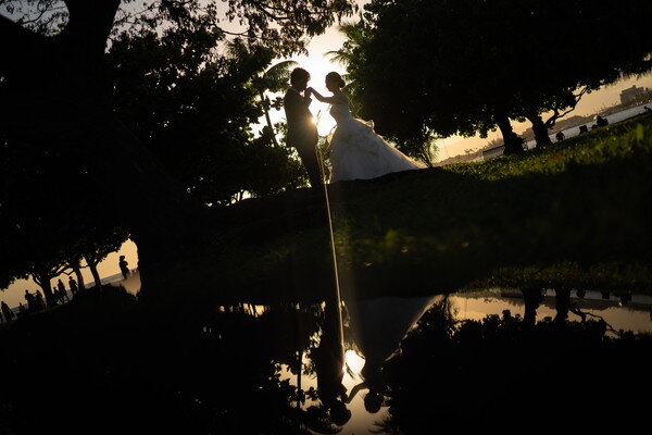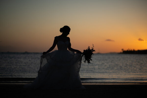 夕方にはサンセットフォトを実施。やわらかなオレンジ色に染まる空の下、おふたりの魅力がより一層引き立つロマンチックな撮影となりました。心地よいハワイの空気に包まれながら、印象的な一日をお過ごしいただきました。