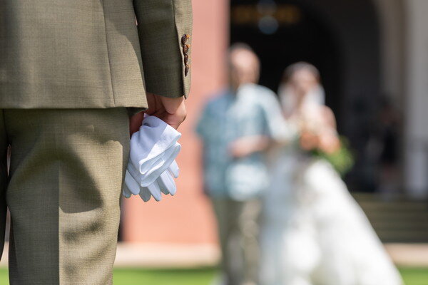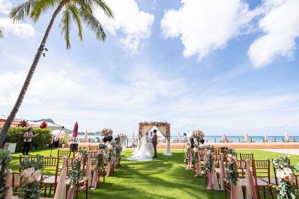 ワイキキビーチを目の前に望む「ロイヤル ハワイアン ウェディング オーシャン ローン」にて、快晴のもとセレモニーが行われました。青い海と芝生のグリーンに囲まれた開放的な空間で、ゲストの拍手に包まれながらおふたりの特別な時間がスタート。