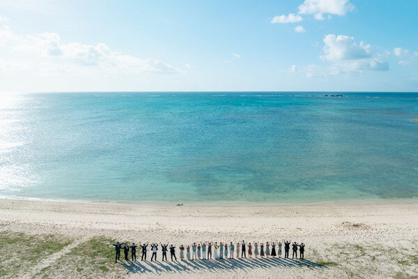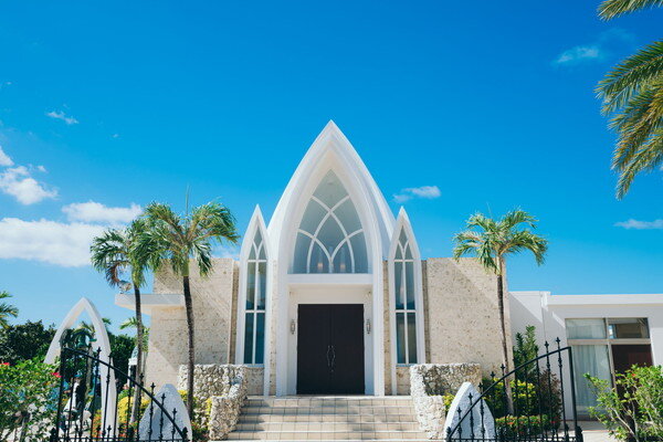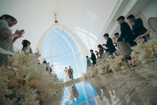 沖縄・読谷の「ザ・ヨミタンリゾート アクアグレイスチャペル」にて、晴天のもとセレモニーが行われました。チャペルから広がる海の景色におふたりも喜ばれ、リラックスした雰囲気の中で特別な時間がスタート。