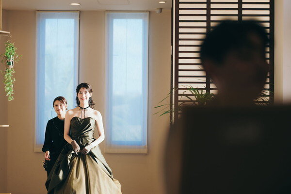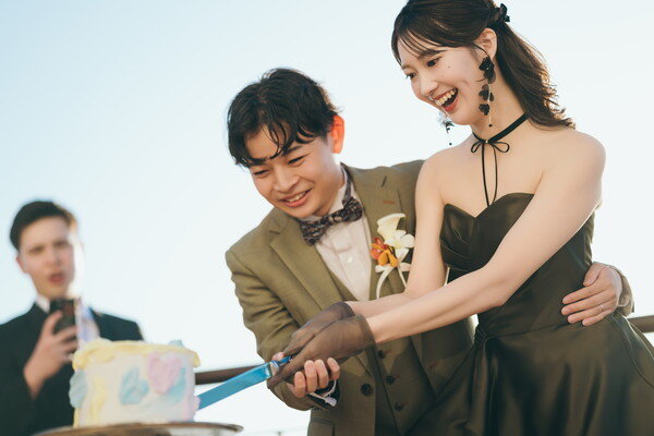 挙式後はガーデンやビーチでの撮影を楽しまれ、ゲストの皆様とともに笑顔あふれるにぎやかなひとときに。お色直しではお互いの姿を褒め合い、サプライズの花束にも喜ばれるなど、おふたりらしい温かなシーンが印象的でした。