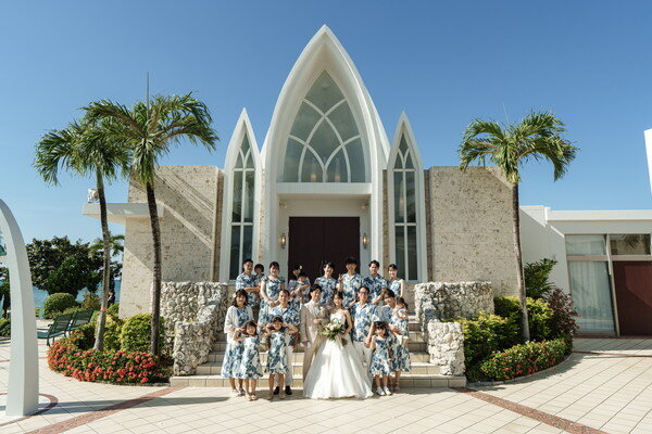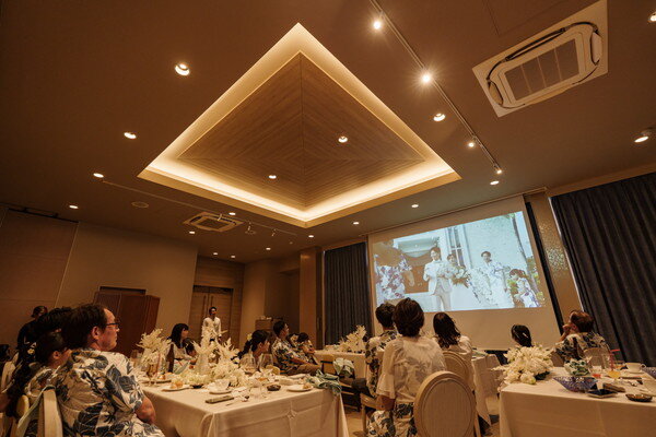 ガーデンでのレイセレモニーではお子様たちも加わり、にぎやかで笑顔あふれるひとときに。ビーチ撮影やサンセットフォトも楽しまれ、沖縄らしい自然を満喫されました。パーティでは三線の演奏やお手紙に加え、エンドロールシネマの上映では、その日の感動がよみがえり、皆様で余韻に浸るひとときとなりました。
